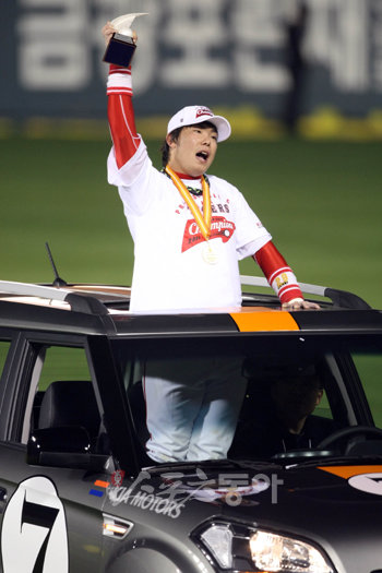 2009 프로야구 한국시리즈 7차전 기아타이거즈 대 SK와이번스 경기가 24일 잠실야구장에서 열렸다. MVP를 차지한 기아 나지완이 부상으로 받은 자동차를 타고 그라운드를 돌고 있다. 잠실 | 김종원 기자 won@donga.com