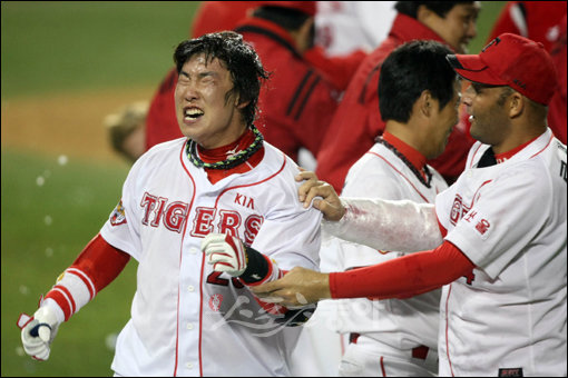 2009 프로야구 한국시리즈 7차전 기아타이거즈 대 SK와이번스 경기가 24일 잠실야구장에서 열렸다. 9회말 1사 기아 나지완의 끝내기 홈런으로 한국시리즈 우승을 확정지은 후 나지완과 로페즈가 기뻐하고 있다.