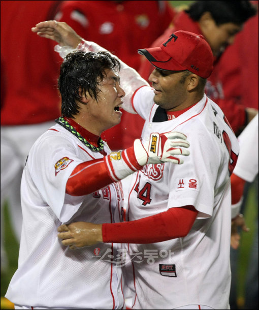 2009 프로야구 한국시리즈 7차전 기아타이거즈 대 SK와이번스 경기가 24일 잠실야구장에서 열렸다. 9회말 1사 기아 나지완의 끝내기 홈런으로 한국시리즈 우승을 확정지은 후 나지완과 로페즈가 기뻐하고 있다. 잠실 | 김종원 기자 won@donga.com