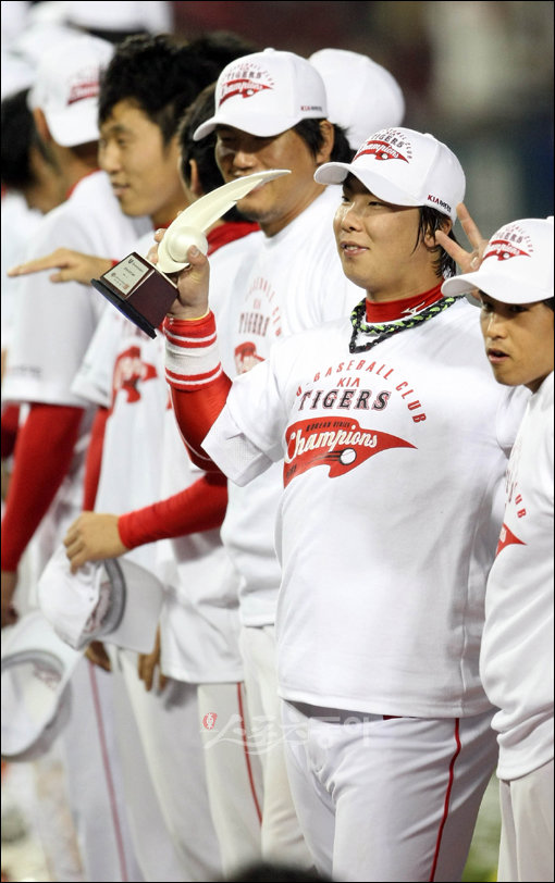 2009 프로야구 한국시리즈 7차전 기아타이거즈 대 SK와이번스 경기가 24일 잠실야구장에서 열렸다. MVP를 차지한 나지완이 사진기자를 향해 V자를 그려 보이고 있다. 잠실 | 김종원 기자 won@donga.com
