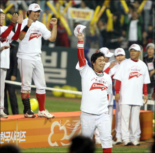 24일 서울 잠실야구장에서 열린 프로야구 SK와 KIA의 한국시리즈 7차전에서 KIA가 9회말 1사 후 나지완의 끝내기 홈런에 힘입어 4-3패로 챔피언에 올랐다. KIA 나지완이 MVP에 오르자 모자를 벗어 인사를 하고 있다.