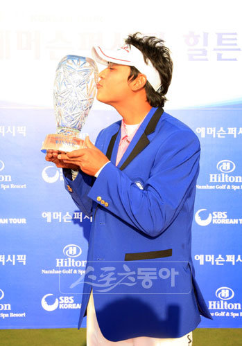 박상현이 25일 열린 한국프로골프 투어 힐튼남해오픈에서 시즌 두 번째 우승을 차지했다. 지난 5월 SK텔레콤오픈에 이어 5개월 만에 우승컵을 들어올린 박상현이 우승컵에 입맞추고 있다.사진제공|KPGA