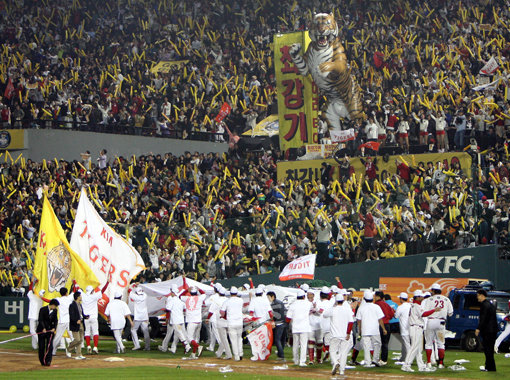 24일 서울 잠실야구장에서 열린 프로야구 SK와 KIA의 한국시리즈 7차전에서 KIA가 9회말 1사 후 안치완의 끝내기 홈런에 힘입어 4-3패로 챔피언에 올랐다. KIA 선수들이 세레모니를 펼치고 있다. 잠실ㅣ 박화용 기자 inphoto@donga.com