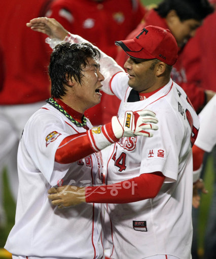 2009 프로야구 한국시리즈 7차전 기아타이거즈 대 SK와이번스 경기가 24일 잠실야구장에서 열렸다. 9회말 1사 기아 나지완의 끝내기 홈런으로 한국시리즈 우승을 확정지은 후 나지완과 로페즈가 기뻐하고 있다. 잠실 | 김종원기자 won@donga.com