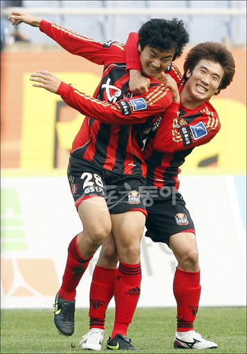 FC서울 이승렬(왼쪽)이 25일 인천 유나이티드 원정에서 후반 31분, 상대 수비와 골키퍼의 사인 미스를 틈 타 골을 터뜨린 뒤 고요한과 기뻐하고 있다. 서울은 이날 승리로 정규리그 1위 희망을 이어갈 수 있게 됐다.인천 | 양회성 기자 yohan@donga.com