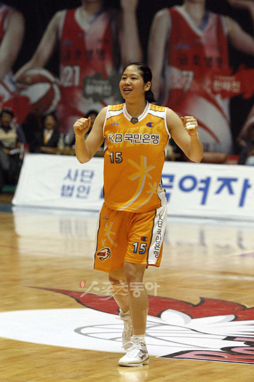 26일 오후 경기도 구리시실내체육관에서 열린 2009 신한은행 여자프로농구 금호생명 대 국민은행의 경기. 국민은행의 곽주영이 역전골을 성공시킨후 기뻐하고 있다 . 70 대 68로 국민은행 승리.