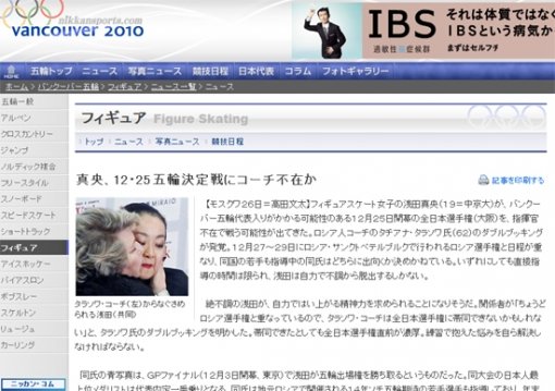 일본 스포츠신문 <니칸 스포츠> 인터넷판은 27일(한국시간) "아사다의 전담 코치일 뿐만 아니라 러시아의 젊은 피겨 선수 지도도 병행하고 있는 타라소바 코치가 전일본선수권과 러시아선수권 일정이 겹쳐 고민 중이다"며 "아사다는 한정된 지도시간을 활용해 자력으로 부진에서 탈출해야 한다"고 밝혔다.