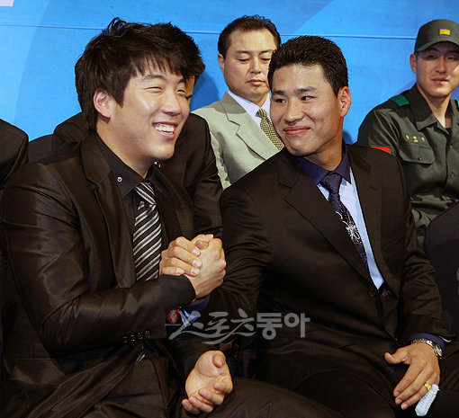 “상현이 형, 축하해요!” “현수야, 고맙다!” KIA 김상현(앞줄 오른쪽)의 MVP 수상이 확정되자 함께 후보에 올랐던 두산 김현수(앞줄 왼쪽)도 기뻐했다. 사이좋게 손을 맞잡은 김상현과 김현수의 모습이 정겹다.박화용 기자 inphoto@donga.com