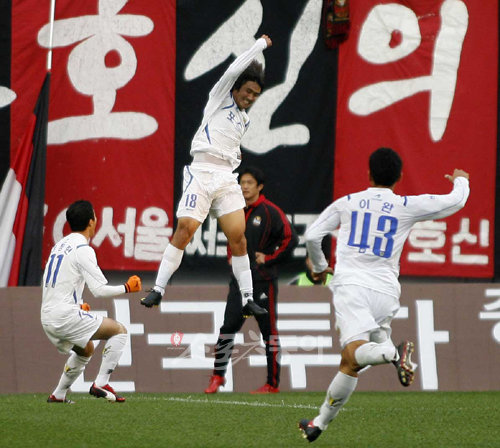 1일 오후 서울월드컵경기장에서 열린 K리그 FC 서울-전남 드래곤즈의 경기. 전남의 정윤성이 동점골을 성공시킨후 기뻐하고 있다.