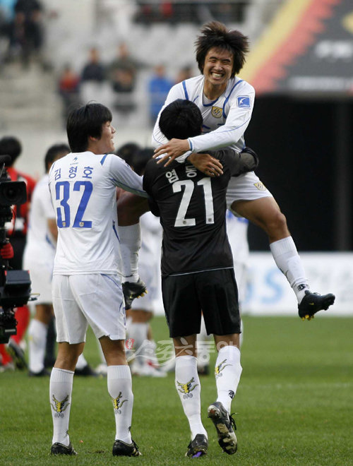 1일 오후 서울월드컵경기장에서 열린 K리그 FC 서울-전남 드래곤즈의 경기. 경기가 끝난후 전남의 정윤성이 염동균을 부둥켜 안고 있다.