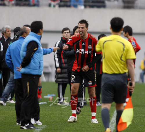 후반 32분, 선취골을 넣은 FC서울의 ‘몬테네그로 폭격기’ 데얀이 상의를 벗으며 전남의 벤치로 달려 갔다.