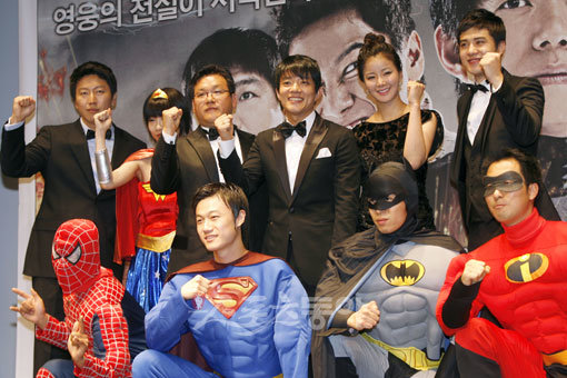 2일 오전 서울 신촌 현대백화점에서 열린 영화 ‘홍길동의 후예’의 제작보고회에서 정용기 감독 및 주연배우들이 슈퍼히어로즈와 포토타임을 갖고 있다.