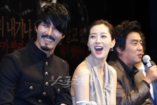 3일 오전 서울 압구정CGV에서 열린 영화 ‘시크릿’(감독 윤재구) 제작보고회에 참석한 배우 차승원(왼쪽)과 송윤아가 간담회 도중 웃음을 터뜨리고 있다.