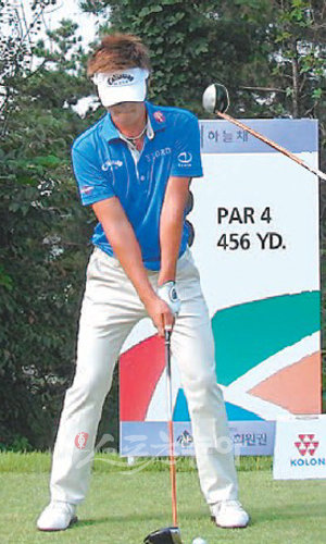 1. 스탠스 폭이 어깨너비보다 넓은 장타자들에게서 볼 수 있는 전형적인 어드레스 자세다. 폭발적인 장타를 위한 준비자세지만 경직된 느낌은 없다. 유연함이야말로 파워의 원천이다.