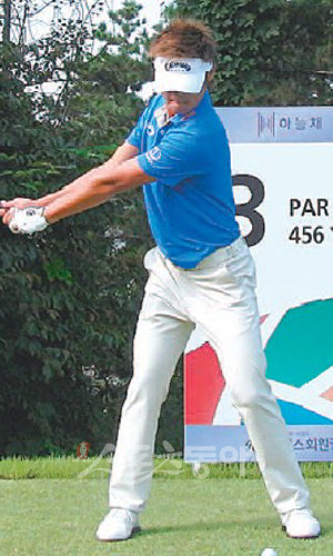 2. 왼팔을 곧게 뻗으며 스윙 아크를 최대한 크게 만든다. 결코 서두르지 않으면서 체중이동과 어깨회전이 동시에 이뤄지고 있지만 시선은 볼에 고정되어 있다.