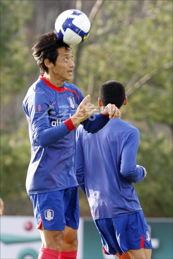 ‘터프가이’의 위용을 다시 찾겠다고 선언한 김남일이 가벼운 헤딩 훈련을 하고 있다. 파주 | 양회성 기자 yohan@donga.com