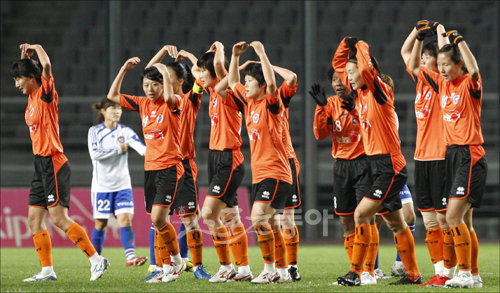 9일 오후 고양종합운동장에서 열린 2009 WK-리그 챔피언 결정전 1차전 대교캥거루스 대 현대제철의 경기에서 후반 터진 대교 이은혜의 첫 골에 동료들이 모여 관중에 인사하고 있다.