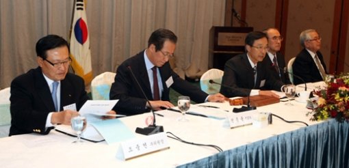 2022월드컵유치를 위한 주역들이 한 자리에 모였다. 왼쪽부터 조중연 대한축구협회장, 정몽준 FIFA 부회장, 한승주 유치위원장, 이홍구 전 총리, 송영식 부위원장. 김종원 기자 won@donga.com