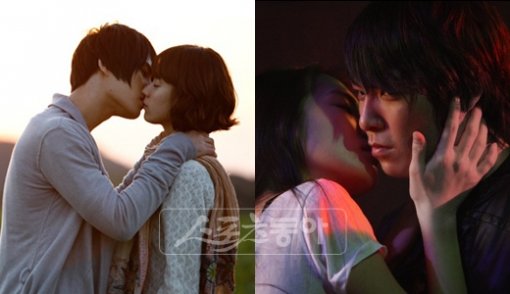 ‘천국의 우편 배달부’에서 한효주와 키스를 나누는 영웅재중(왼쪽 사진)과 ‘19’에서 신인 연기자 신민희와 키스신을 촬영한 탑(오른쪽). 사진제공 | 삼화네트웍스