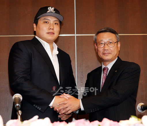 13일 새벽 일본 프로야구 롯데 마린스와 전격 계약을 한 김태균이 소공동 롯데 호텔에서 입단 기자회견을 가졌다. 김태균이 세토야마 류지 사장과 악수를 하며 포즈를 취하고 있다.