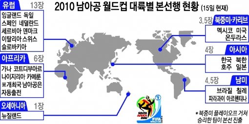 마지막 티켓의 주인공은 누가 될 것인가. 각 대륙에서 사활을 건 플레이오프가 한창 진행되고 있는 가운데 2010남아공월드컵 본선 진출국들이 속속 결정되고 있다. 주말을 맞이해 그 어느 때보다 뜨겁게 전개됐던 전 세계의 ‘축구 전쟁’을 정리했다.