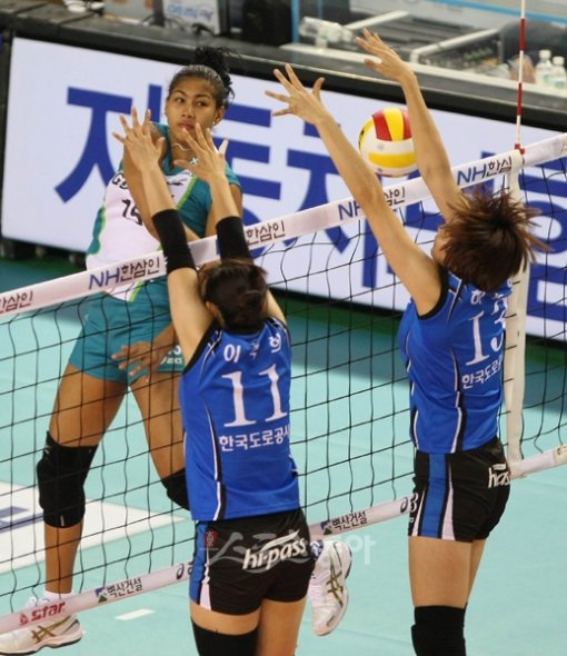 GS칼텍스 이브(정면 얼굴)가 17일 천안 유관순체육관에서 열린 2009∼2010 NH농협 V리그 도로공사와의 경기에서 수비수 두 명을 앞에 두고 스파이크를 날리고 있다. 하준임(오른쪽)의 블로킹에 막힌 게 옥에 티. 천안 | 김종원 기자 won@donga.com