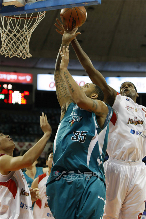 18일 서울 잠실학생체육관에서 열린 2009∼2010 KCC 프로농구 SK 나이츠 대 동부 프로미 경기에서 SK 워커가 동부 챈들러의 슛블록에 성공하고 있다.