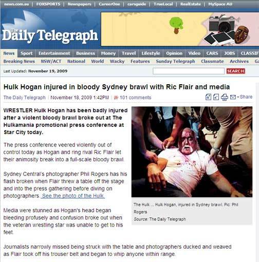 데일리텔레그래프 등 외신들은 호건이 18일 호주 시드니 스타시티에서 열린 헐크 매니아 공식 기자회견 중 WWE의 전 헤비급 챔피언인 라이벌 릭 플레어(60)에게 얻어 맞았다고 전했다.