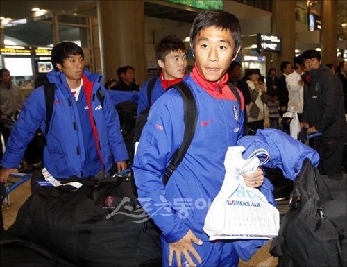 덴마크·세르비아와의 유럽원정 평가전을 마친 한국축구대표팀이 19일 오후 인천국공항을 통해 입국했다. 입국장을 나온 대표팀 오범석 등 선수들이 짐을 챙기고 있다.