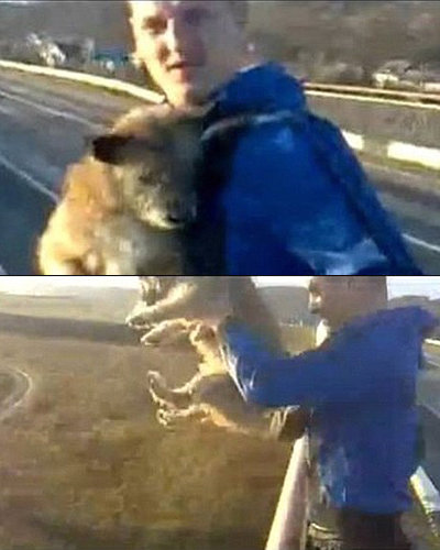 개가 날 수 있는지 실험해보겠다며 다리 위에서 개를 투척하는 모습. 이 동영상은 유튜브에 올라 누리꾼들을 충격에 빠트렸다.