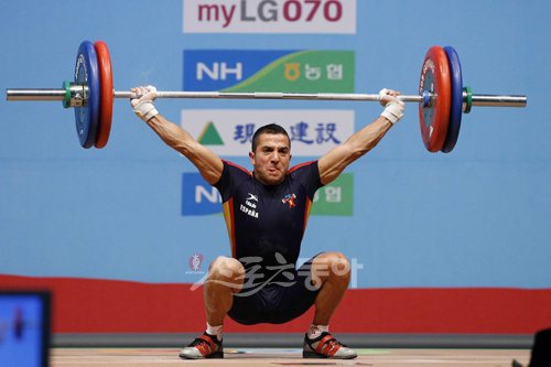 20일 오후 경기도 고양시 킨텍스에서 열린 ‘2009 세계역도선수권대회’ 남자부 62kg급 C그룹 경기 인상 2차시기에서 헤르난데스(스페인)가 힘차게 바벨을 들어 올리고 있다.