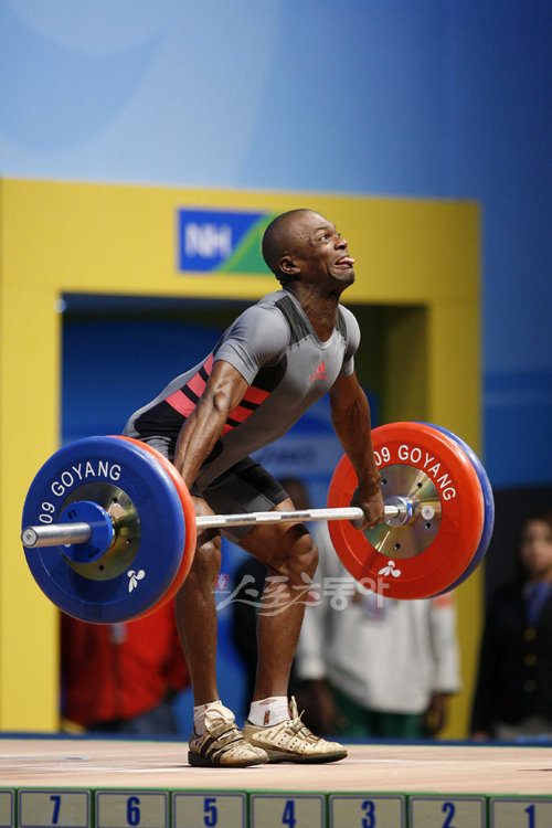 20일 오후 경기도 고양시 킨텍스에서 열린 ‘2009 세계역도선수권대회’ 남자부 62kg급 C그룹 경기 인상 2차시기에서 감바(카메룬)가 힘차게 바벨을 들어 올리고 있다.