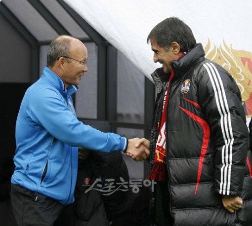 박항서 전남 감독(왼쪽)과 귀네슈 서울 감독이 1일 리그 최종전에 앞서 악수를 하고 있는 모습. 상암 | 임진환 기자 photolim@donga.com