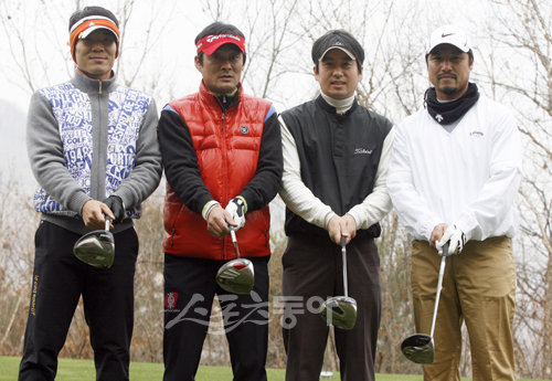 23일 경기도 남양주 해비치 CC에서 열린 제28회 야구인골프대회에 출전한 이종범 선수(왼쪽에서 두번째)가 같은 조에 편성된 이대진 선수(왼쪽)와 곽현희 코치(오른쪽)와 나란히 포즈를 취하고 있다.