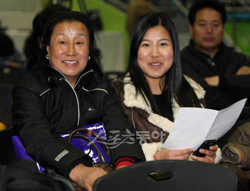 4번의 수술을 이겨낸 사재혁 괴력의 힘은 가족에서 나온다. 어머니 김선이(왼쪽) 씨와 동생 사미용 씨가 2009 고양 세계역도선수권이 벌어진 24일 킨텍스 경기장을 찾아 아들을 응원하고 있다. 고양 | 김종원 기자