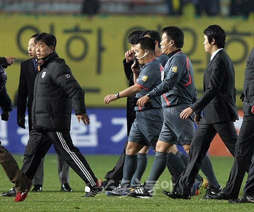 2009 프로축구 준플레이오프 성남일화 대 전남드래곤즈 경기가 25일 성남종합운동장에서 열렸다. 경기 종료 후 심판들이 경호를 받으며 그라운드를 빠져 나가고 있다. 성남 | 김종원기자 won@donga.com