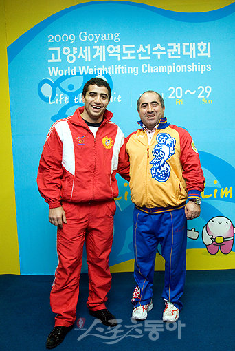 19일 경기도 고양 킨텍스에서 개막한 2009고양세계역도선수권대회. 22일 남자 69kg급에서 은메달(합계)을 획득한 아라켈 미르조얀(20·아르메니아공화국)의 코치는 바로 아버지 옥슨 미르조얀(48)이다. 옥슨은 소련 유니폼을 입고 출전한 1988서울올림픽 역도 남자 56kg급에서 금메달을 목에 걸었다. 당시 옥슨의 합계 기록은 300kg. 옥슨은 “그 날을 기념하기 위해 전화번호와 차번호 뒷자리를 모두 300으로 정했다”며 웃었다.
