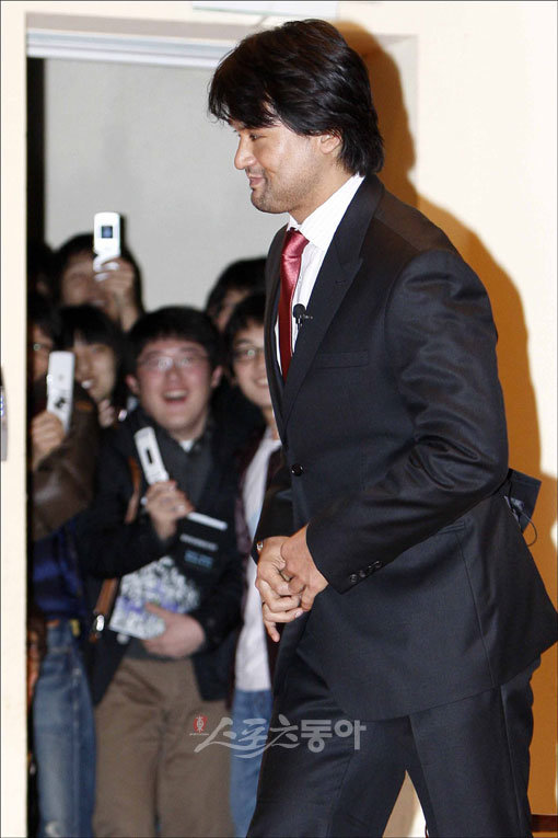 박찬호가 학생들의 환호 속에 강단에 들어고 있다.