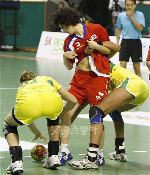 27일 오후 서울 잠실학생체육관에서 열린 ‘SK국제여자핸드볼 그랑프리2009’ 한국-브라질의 경기에서 한국 김온아가 상대 수비수를 사이에서 고전하고 있다.