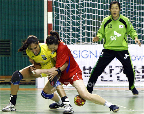 27일 오후 서울 잠실학생체육관에서 열린 ‘SK국제여자핸드볼 그랑프리2009’ 한국-브라질의 경기에서 한국 강지혜가 상대 파비아나와 심한 몸싸움을 벌이고 있다.
