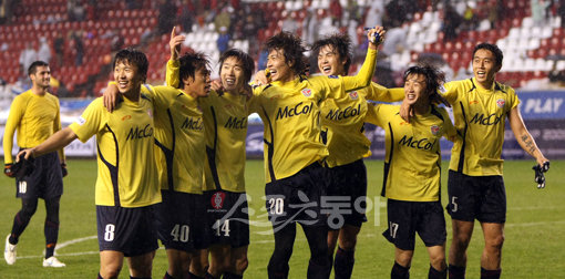 2009 프로축구 플레이오프 포항스틸러스 대 성남일화 경가가 29 포항 스틸야드에서 열렸다. 1-0 승리하며 챔피온 결정전에 진출한 성남 선수들이 환호하고 있다. 포항 | 김종원기자 won@donga.com