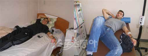“주사 맞으니 힘이 불끈” 30일 성남 선수단 숙소에서 링거를 맞고 있는 몰리나(왼쪽)와 라돈치치. 항산화제가 포함된 링거 주사로 성남 선수들의 배터리는 재충전됐다. 성남 | 남장현 기자 yoshike3@donga.com
