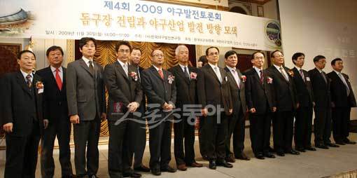 사단법인 한국야구발전연구원(원장 한양대 김종 교수)은 30일 서울 논현동 임피리얼 팰리스 호텔에서 ‘돔구장 건립과 야구산업 발전 방향 모색’을 주제로 제4회 2009 야구발전토론회를 열었다. 해설가 허구연 씨와 이용철 씨를 비롯한 야구인들과 돔구장 건립을 추진 중인 안산, 광주, 대구 등의 지자체 관계자들까지 100여명이 참석한 이날 토론회에서는 돔구장 신축과 구장 현대화를 통해 열악한 국내 야구 인프라를 개선하기 위한 방안이 논의됐다.첫 발표자로 나선 정희윤 스포츠경제연구소장은 “경기장 신축은 관중 증가 효과로 연결되며 돔구장일 경우 증가율은 더 클 것으로 예상된다”고 밝혔다. 그 근거로 제시한 일본의 사례들은 시사하는 바가 컸다. 요미우리(도쿄돔·1988년) 소프트뱅크(후쿠오카돔·1993년) 주니치(나고야돔·1997년) 세이부(세이부돔·1999년) 니혼햄(삿포로돔·2004년) 등 일본프로야구 5개 구단은 돔구장을 건립한 첫 해 전년도에 비해 적게는 11%%, 많게는 47%%에 이르는 관중 증가를 경험했다. 두 번째 발표자로 나선 일본 덴쓰 스포츠사업국의 하나우치 마코토 부장은 일본의 돔구장 현황과 프로스포츠 전반의 수익구조에 대해 소상히 설명한 뒤 “올림픽 우승과 WBC 준우승을 달성한 한국의 (야구) 경기력은 세계 최고 수준이다”라며 “건조한 기후의 미국과 달리 일본과 한국 등 비가 많은 아시아권에서는 돔구장, 관중석에 넓은 지붕이 덮인 야구장 건설이 바람직하다”고 조언했다.