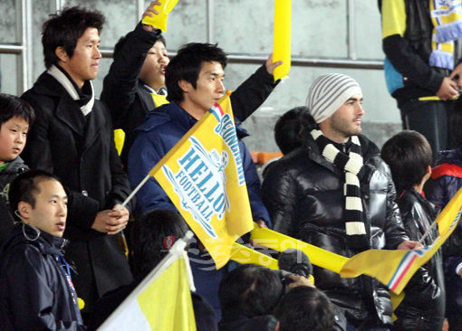 성남의 이호, 장학영, 라돈치치(왼쪽부터)가 2일 열린 챔피언결정 1차전을 관중들과 함께 관중석에서 지켜보며 동료들을 응원하고 있다. 이호와 라돈치치는 경고누적, 장학영은 플레이오프전에서 받은 레드카드로 경기에 출전하지 못했다.성남 | 박화용 기자 inphoto@donga.com