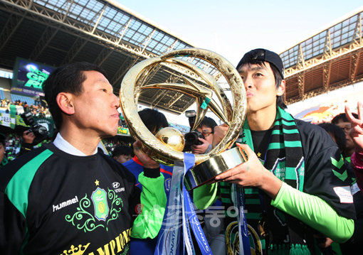 두명의 영웅, ‘완산벌 신화’ 빚다 전북 현대 최강희 감독(왼쪽)과 이동국이 6일 전주월드컵경기장에서 열린 성남과의 챔피언결정 2차전에서 승리한 뒤 우승트로피에 입맞춤하고 있다. 전북은 창단 15년 만에 첫 우승의 감격을 누렸다. 전주 | 박화용 기자 inphoto@donga.com