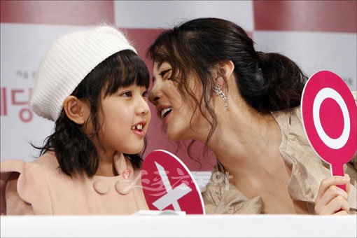 배우 송윤아(오른쪽)와 김향기가 8일 오전 서울 압구정CGV에서 열린 영화 ‘웨딩드레스’(감독 권형진·제작 로드픽쳐스) 제작보고회에서 사회자의 질문에 귓속말을 주고받으며 다정한 모습을 보이고 있다.