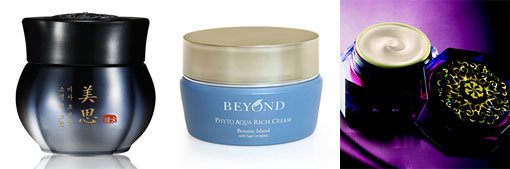 화장품 베이스로 사용하는 물이 정제수에서 한방 약재와 식물에서 추출한 물로 바뀌고 있다. 왼쪽부터 미샤 ‘초보양 소생 진 크림’, LG생활건강 ‘비욘드 피토 아쿠아 리치 크림’, 더페이스샵 ‘명한미인도 더할 나위 없는 환생고’. 사진제공 | 각 회사