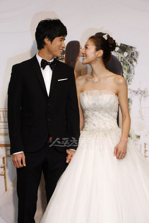 11일 서울 광장동 워커힐호텔에서 정조국-김성은 커플이 결혼식을 올리기 전 가진 기자회견에서 취재진들을 향해 포즈를 취하고 있다.