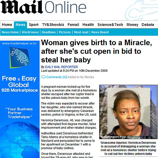 사건의 내막은 이렇다. 평소 여성 노숙자 쉼터를 자주 방문해 아담스와 안면이 있던 데라무스는 지난 1일 그에게 아기 옷 등을 주겠다고 자신의 집으로 유인해 욕실에 강제로 감금했다. 아이를 빼앗을 목적으로 납치를 계획한 데라무스는 그가 출산할 때까지 기다리다가 심지어 제왕절개까지 시도하려 한 것으로 알려져 충격을 주고 있다.