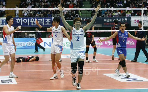 13일 인천 도원시립체육관에서 열린 2009-2010V리그 대한항공과 현대캐피탈의 경기에서 대한항공이 3-0으로 승리하자 선수들이 기뻐하고 있다.